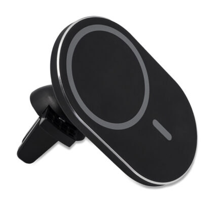 Bezprzewodowa ładowarka samochodowa 15W. Ładowarka posiada uniwersalne mocowanie pasujące do otworów wentylacyjnych w samochodzie. Kompatybilna z telefonami z technologią MagSafe. Zawiera dodatkowy metalowy pierścień do obsługi ładowania innych niemagnetycznych telefonów bezprzewodowego ładowania.
