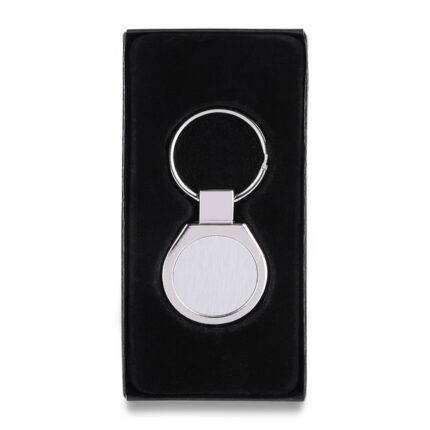 Metalowy brelok o bardzo dużej powierzchni do prezentacji logotypu. Pakowany w czarne opakowanie upominkowe.
