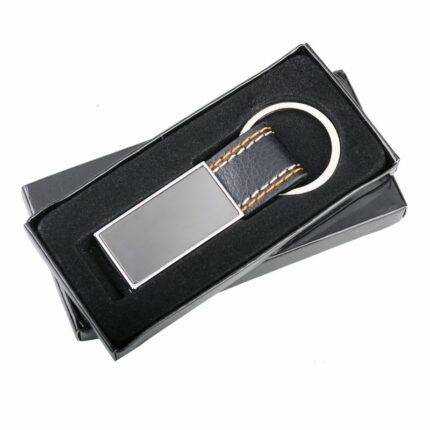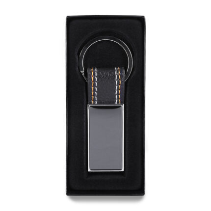 Elegancki brelok o czarnej matowej powierzchni. Wykonany z metalu i poliestru. Pakowany w czarne pudełko upominkowe.