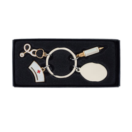 Metalowy brelok z medycznymi motywami. Zawiera 4 zawieszki: czepek pielęgniarski, stetoskop i strzykawka oraz zawieszka idealna pod grawer. Pakowany w czarne opakowanie upominkowe.