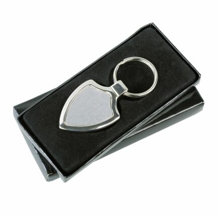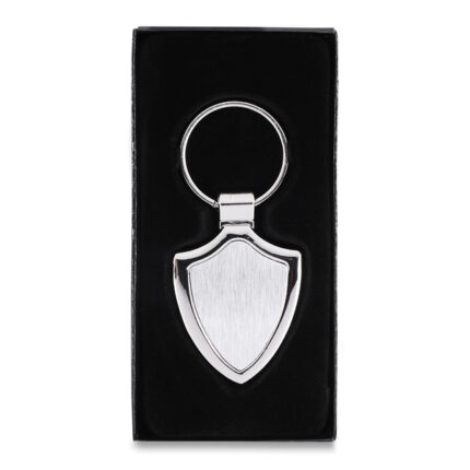 Metalowy brelok stworzony z myślą o umieszczeniu na nim herbu lub godła. Pakowany w czarne opakowanie upominkowe.