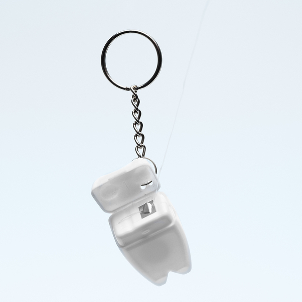 Brelok w kształcie ząbka z nicią dentystyczną o długości 5 m.