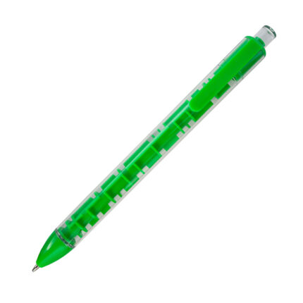 Długopis Maze R73450.05 w zielonym kolorze z przezroczystym korpusem i mini labiryntem z metalowymi kulkami to niebanalny gadżet piśmienniczy z wkładem w kolorze niebieskim, który łączy funkcję długopisu z elementem zabawy. Wymiary: szer. 145 × wys. 12 × gł. 12 mm — lekki i poręczny.