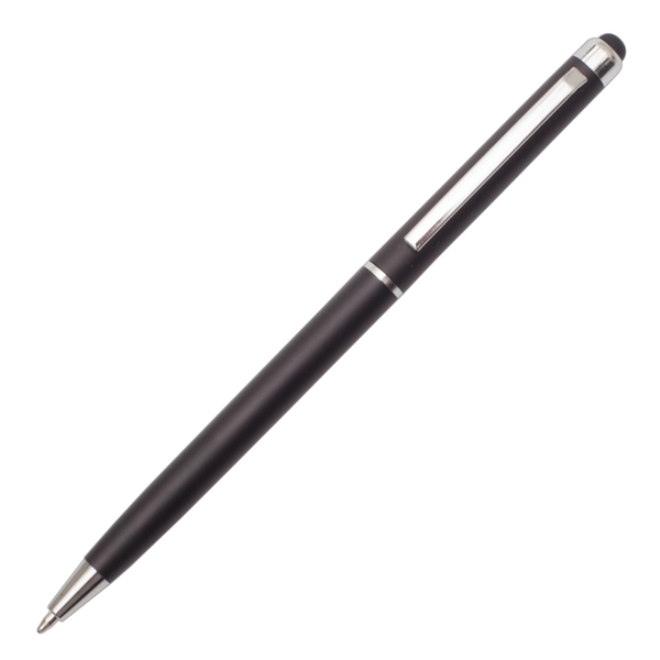 Długopis z końcówką przystosowaną do ekranów dotykowych. Korpus wykonany z aluminium, skuwka z metalu. Wkład w kolorze niebieskim. Posiada obrotowy mechanizm włączania.