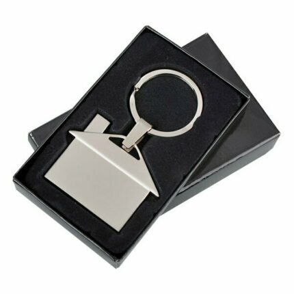 Metalowy brelok - domek. Pakowany w czarne kartonowe opakowanie upominkowe.