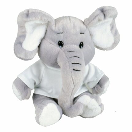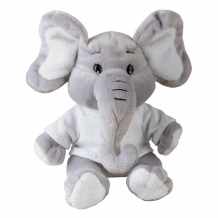 Maskotka w kształcie słonia w koszulce, na której można umieścić logotyp.