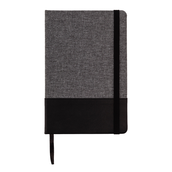 Notatnik A5 w twardej oprawie pokrytej tkaniną i ekoskórą, z tasiemką do zaznaczania strony oraz elastyczną gumką chroniącą wnętrze. 80 kartek w linie, gramatura papieru 70 g/m2.