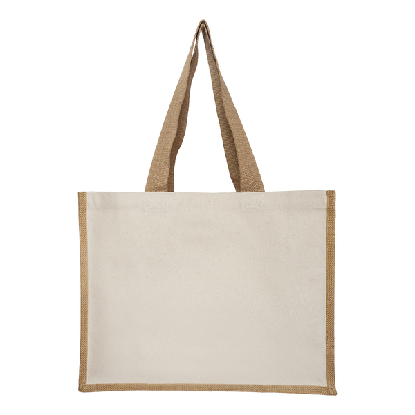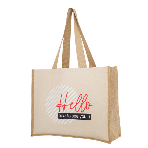 Ekologiczna torba na zakupy wytworzona z juty, z dbałością o środowisko naturalne. Bawełniane rączki. Torba wewnątrz laminowana. Uprawy juty pochłaniają duże ilości dwutlenku węgla, nie wymagając przy tym nawadniania ani nawożenia. Produkt może być poddany procesowi recyklingu.