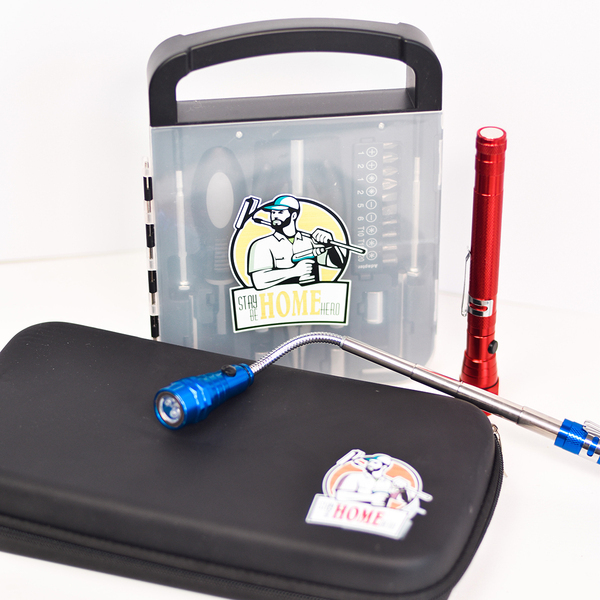 Wieloelementowy zestaw narzędzi w pudełku zamykanym na magnes. Zawiera: poziomicę z uchwytem (1/4”), uchwyt wkrętakowy (4 mm) z grzechotką, magnetyczny, wkrętak PHO (krzyżowy), – 2 rozmiary (1/4”), wkrętak płaski (1/4”) – 4 rozmiary, nóż tapicerski, wkrętak płaski – 4 rozmiary (4 mm), wkrętak PH (krzyżowy) – 4 rozmiary (4 mm), klucz imbusowy – 3 rozmiary.