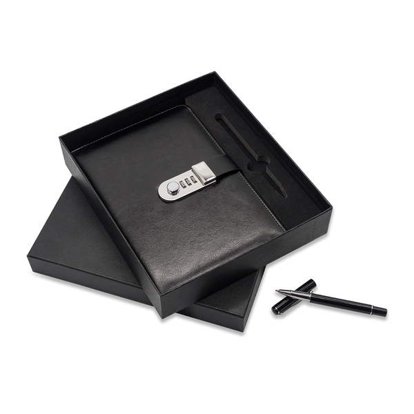 Zestaw notes z szyfrem i długopis WINDSOR czarny to elegancki komplet piśmienniczy, który zawiera zabezpieczony szyfrem notes i dopasowany długopis — idealny do notatek, planowania i jako prezent. Notes ma twardą okładkę, a długopis zapewnia płynne pisanie.