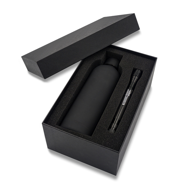 Zestaw upominkowy składający się z butelki próżniowej i latarki. Butelka o pojemności 500 ml. Wewnętrzna ścianka wykonana ze stali o podwyższonej jakości 18/8, ścianka zewnętrzna wykonana ze stali 18/0 o przyjemnym w dotyku wykończeniu. Utrzymuje temperaturę powyżej 40°C do 15 godzin. Metalowa wysuwana latarka. Teleskop o długości 38,5 cm. Wyposażona w 3 białe diody LED, 10 lumenów. Zaopatrzona w klips oraz magnesy na obu końcach. Zasilana 4 bateriami typu AG13 (w zestawie). Całość w eleganckim upominkowym pudełku.