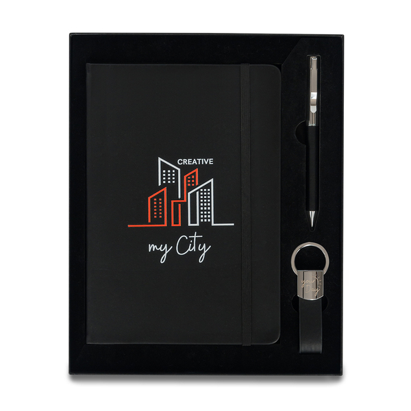 Zestaw upominkowy Nebraska to stylowy i praktyczny komplet piśmienniczy, który łączy w sobie funkcjonalność codziennych narzędzi piśmienniczych z eleganckim wykonaniem, idealnym na prezent dla partnerów biznesowych, klientów lub pracowników. Zestaw składa się z notesu w formacie A5, długopisu z niebieskim wkładem oraz breloka do kluczy — wszystkie elementy wykończone estetyczną ekoskórą w kolorze czarnym, co podkreśla profesjonalny charakter produktu. Całość zapakowana jest w czarne pudełko upominkowe, które zabezpiecza komplet i jednocześnie prezentuje się efektownie podczas wręczania.