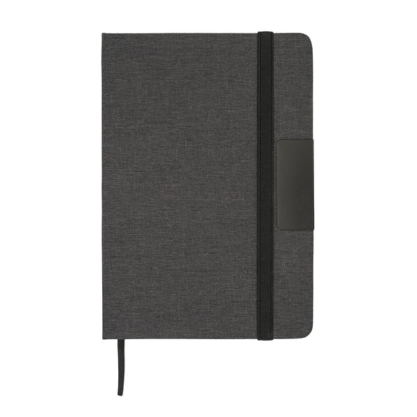 Biznesowy zestaw składający się z butelki próżniowej, notesu i długopisu. Całość zapakowana w eleganckie, czarne pudełko. Butelka próżniowa ze stali nierdzewnej o podwójnych ściankach (stal 18/8 wewnątrz, 18/0 na zewnątrz), ze składanym uchwytem. Utrzymuje temperaturę powyżej 40°C do 15 godzin. Pojemność 500 ml. Notatnik formatu A5, twarda okładka z tkaniny RPET, ozdobiona czarnym metalowym elementem; 80 kartek w kratkę, o gramaturze 70 g/m². Metalowy długopis ozdobiony tkaniną RPET. Niebieski wkład 1,0 mm.