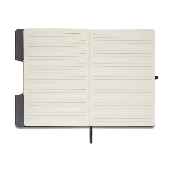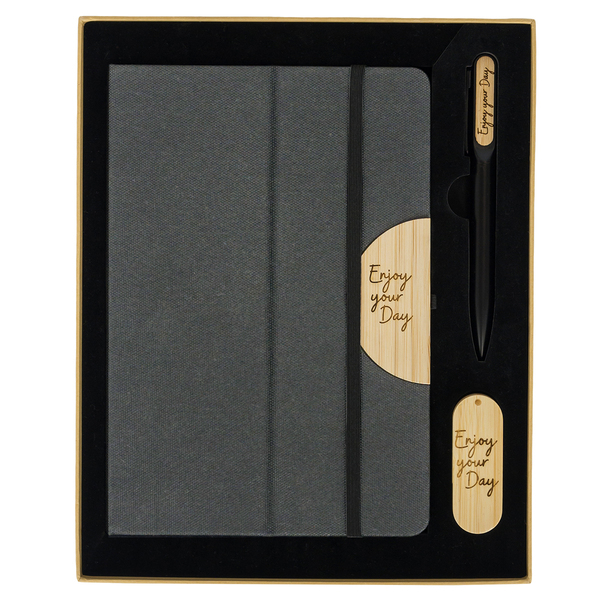 Zestaw upominkowy składający się z pamięci USB o pojemności 64GB, notesu A5 w okładce z tkaniny RPET i długopisu. Notes 80 kartek w linie (papier 70 g/m2), posiada uchwyt na długopis. Twardą oprawę notesu można zmienić w podstawkę pod telefon. Długopis aluminiowy o matowym wykończeniu, wyposażony w niebieski wkład. Wszystkie elementy w bambusowym wykończeniu. Zestaw pakowany w upominkowe pudełko.