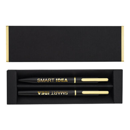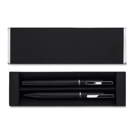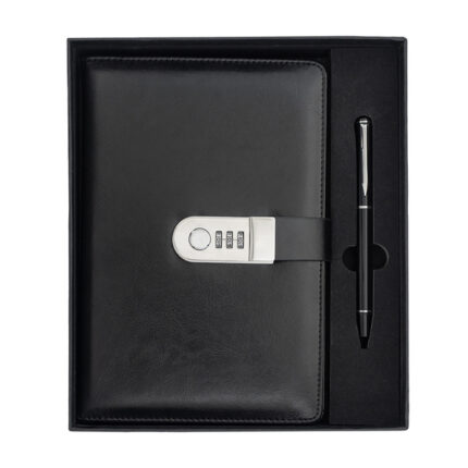 Zestaw notes z szyfrem i długopis WINDSOR R02336.02 to elegancki komplet piśmienniczy w czarnym kolorze — notes A5 (100 kartek w linie z zamkiem szyfrowym). Długopis z niebieskim wkładem, zapakowany w pudełko prezentowe. Produkt nadaje się do znakowania.