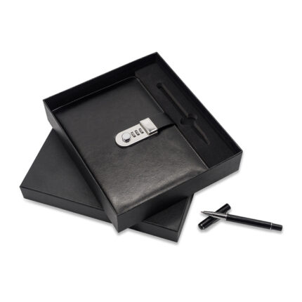 Zestaw notes z szyfrem i długopis WINDSOR czarny to elegancki komplet piśmienniczy, który zawiera zabezpieczony szyfrem notes i dopasowany długopis — idealny do notatek, planowania i jako prezent. Notes ma twardą okładkę, a długopis zapewnia płynne pisanie. Czarny kolor i funkcje zabezpieczenia; Produkt nadaje się do znakowania.