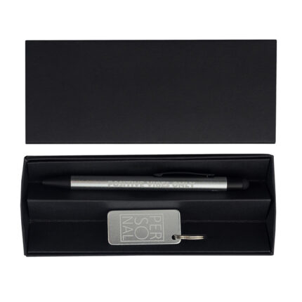 Zestaw Couple to elegancki i praktyczny upominek o wymiarach Brelok: 50 x 24 x 2 mm; Długopis: 145 x 10 x 10 mm.