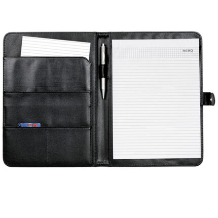Wykonana z ekoskóry, czarna teczka wyposażona w kieszonkę na wizytówki - mieści 20 wizytówek, przegródkę na dokumenty oraz wkład papierowy A4(20 kartek). Kartka w linię. Długopis nie jest dołączony. Wyjątkowa teczka A4 Taormina w kolorze czarnym to połączenie elegancji i funkcjonalności w jednym. Idealna do codziennego użytku, na spotkania biznesowe oraz jako stylowy dodatek w pracy. Wykonana z wysokiej jakości materiałów, doskonale sprawdzi się w każdej sytuacji, zapewniając trwałość i praktyczność. Produkt nadaje się do znakowania.