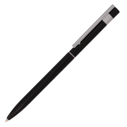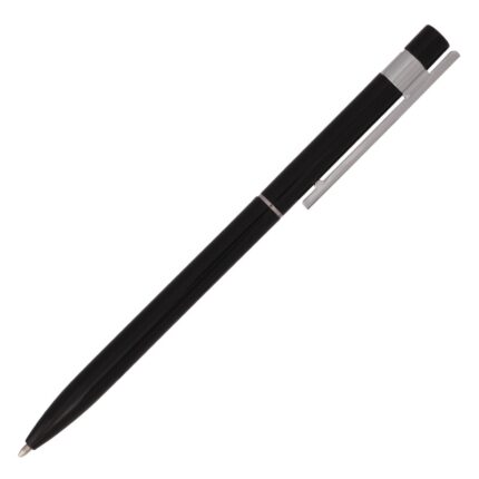 Aluminiowy długopis z metalową skuwką. Wyposażony w niebieski wkład.